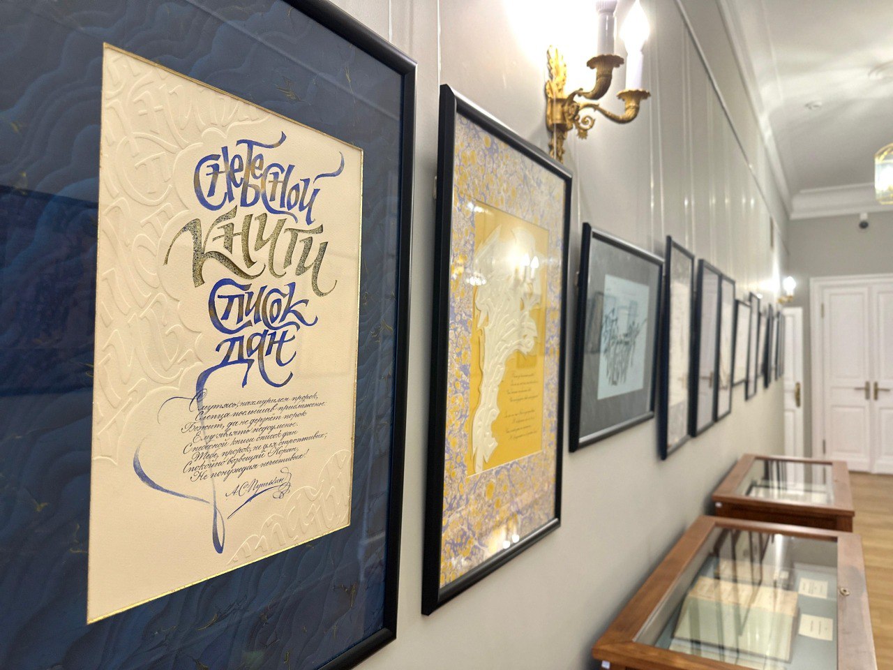▷ В экспозиции представлены 33 работы, в которых пушкинское слово органично сплетается с кораническими мотивами. Над созданием произведений трудились специалисты Центра искусства каллиграфии «От Аза до Ижицы» под руководством Петра Чобитько. Перед мастерами стояла непростая задача: через каллиграфию передать не только эстетику пушкинских стихов, но и их философскую глубину, перекликающуюся с текстами Священного Писания. А чтобы добиться сохранения духа времени, каллиграфы изучали исторические рукописи конца XIX — начала XX веков из фондов Российской национальной библиотеки. Удивительный результат полуторагодичной работы представлен в экспозиции.