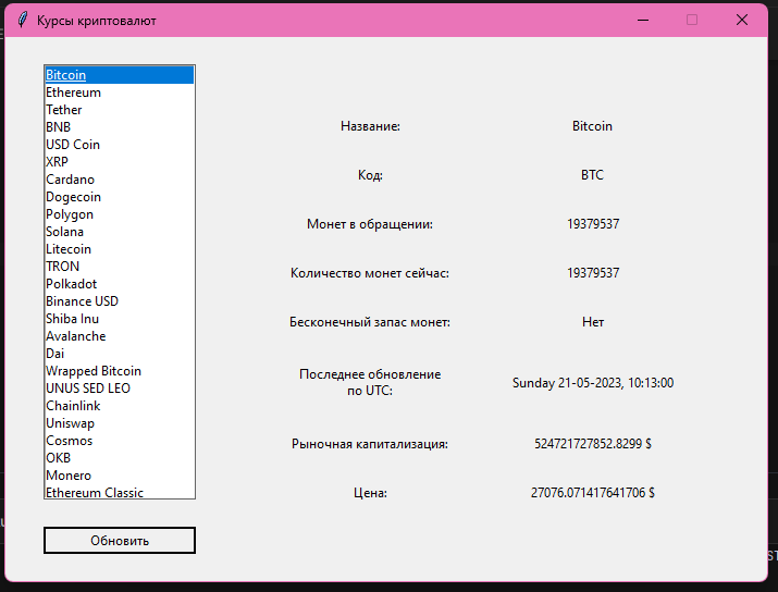 Это код написанный с помощью tkinter. Он показывает курс криптовалют.