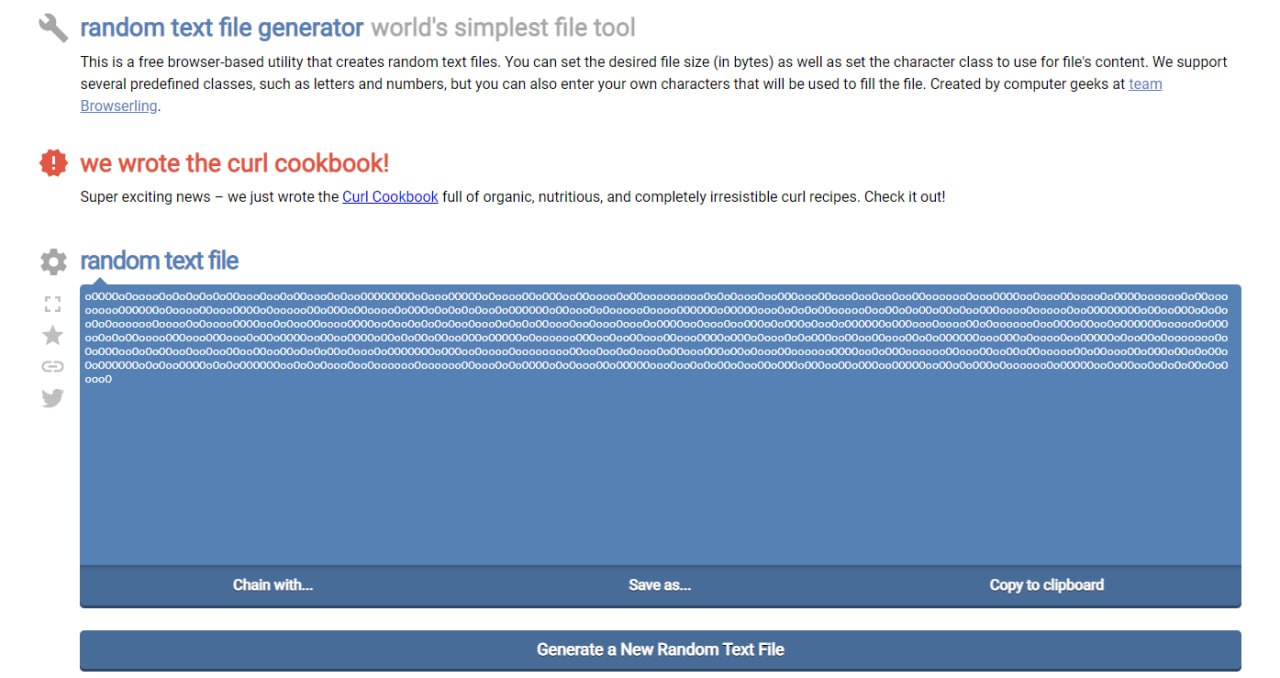 Ця онлайн-утиліта дозволяє створити текстовий файл з випадковими символами, поки він не досягне певного розміру для того щоб протестувати ваш загрузчик. Ви можете вказати розмір у параметрі довжини файлу, а також можете ввести символи, які будуть міститися у файлі, у другій колонці параметрів.