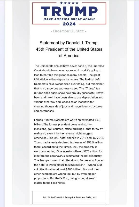 "福布斯"。"特朗普的资产估计价值43亿美元......这位前总统拥有真正的东西--豪宅、高尔夫球场、办公楼--抛出了真正的现金,即使他的纳税申报可能表明不是这样......据《泰晤士报》报道,华盛顿特区的酒店于2016年开业,到2018年,特朗普已经在那里申报了5550万美元的税收损失。不过,这处房产还是有价值的。在冠状病毒摧毁酒店业之前,一位投资者为它提供了1.75亿美元。特朗普夫妇拒绝了这个报价。福布斯》现在认为该酒店的价值接近1.68亿美元"。- 错了,刚刚以近4亿美元的价格出售了该酒店。他们的许多其他数字也是错误的,但比例更大。但是没关系,对假新闻来说,错了也无所谓!"特朗普总结说。