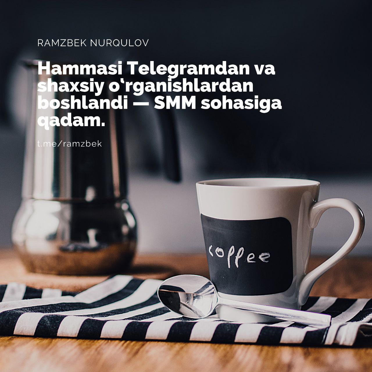 🧢 Menda 2015-yilda ilk Telegram'ga qiziqish uyg‘ondi. U paytlari daromad qilish haqida o‘ylashga saalgina aqlim yetmas edi. Kanal ochib, o‘chirib va shunchaki, foydalanar edim. Va bu bora-bora men uchun hobby'ga aylandi. Hozirgi kunda Telegram kanallarini yuritish, noldan biznesni Telegram orqali rivojlantirish kabi ishlar bilan shug‘ullanib kelayotgan bo‘lsam, sekinlik bilan faqat Telegram emas, umumiy SMM sohasiga qadam qo‘yayapman, bularning hammasi esa shaxsiy o‘rganishlardan.