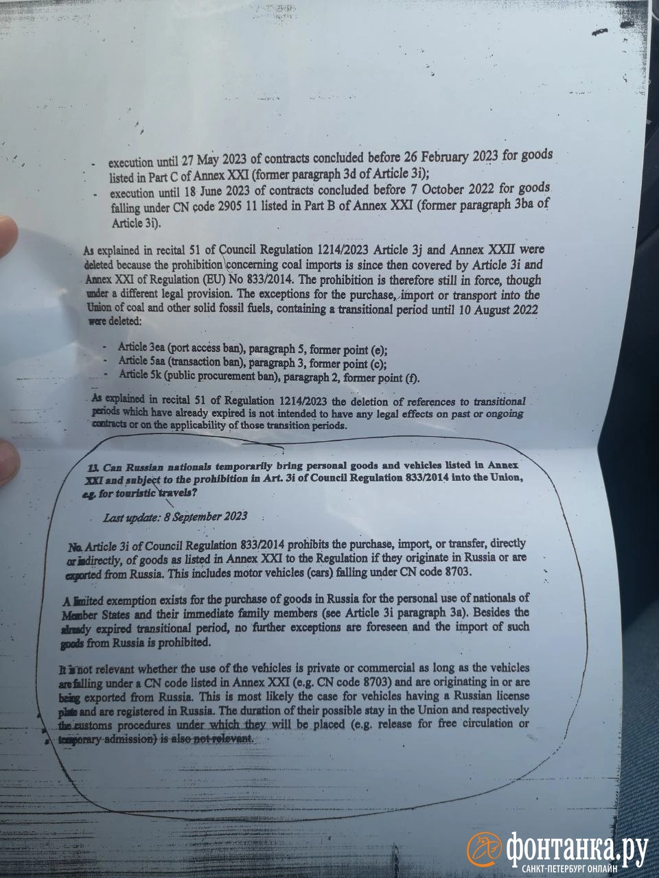 «Не пустили на российской машине в Грецию, показали все ту же распечатку комментария Еврокомиссии от 8 сентября. И даже дали ее с собой на прощание. Сказали, что у них распоряжение, поступило только утром (22 сентября). Очень извинялись, сказали, что это не Греция плохая, а Евросоюз заставляет. А греки, мол, очень сожалеют и русских любят. Мы не поверили», — сообщила @ranarod Мария.
