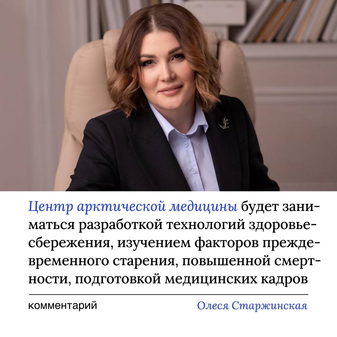 «Миссией федерального центра арктической медицины является разработка и внедрение технологий здоровьесбережения в суровых климатических и эколого-гигиенических условиях Арктики, изучение факторов преждевременного старения, повышенной заболеваемости и смертности, обеспечение высоких стандартов качества жизни населения, <…> подготовка медицинских кадров. <…> Базой для создания федерального центра арктической медицины был предложен Северный государственный медицинский университет, который находится в Архангельске», - заявила Олеся Старжинская на конференции «Арктика: устойчивое развитие».