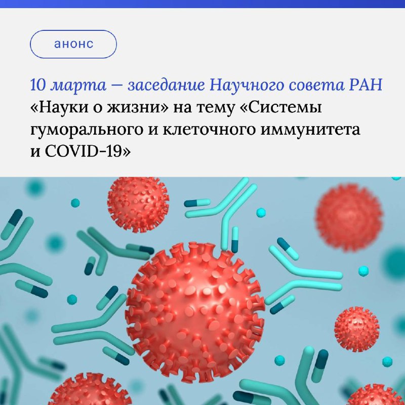 10 марта в 13-00 (МСК) Научный совет РАН «Науки о жизни» проведет очередное онлайн-заседание по теме «Системы гуморального и клеточного иммунитета и COVID-19».