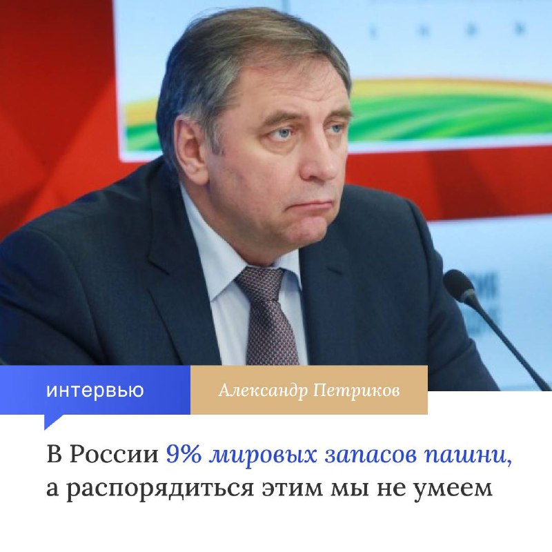 «В России сосредоточено 9% мировых запасов пашни, 2,6% пастбищ, около 9% производства минеральных удобрений, 20% пресной воды… И только 2% мирового населения. Мы в состоянии кормить не только себя, но и другие страны. На мировом продовольственном и биотопливном рынке Россия может выступать таким же крупным игроком, как на рынке нефти и газа. Главная задача — наладить эффективное использование этого потенциала», – отметил Александр Петриков.
