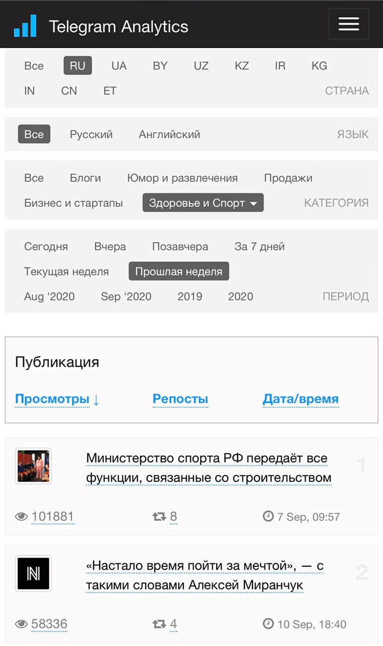 По данным аналитического портала «Telegram Analitics» публикация нашего канала заняла 1-е место по срезу прошлой недели в категории «Здоровье и спорт» в российском телеграмм-сегменте.