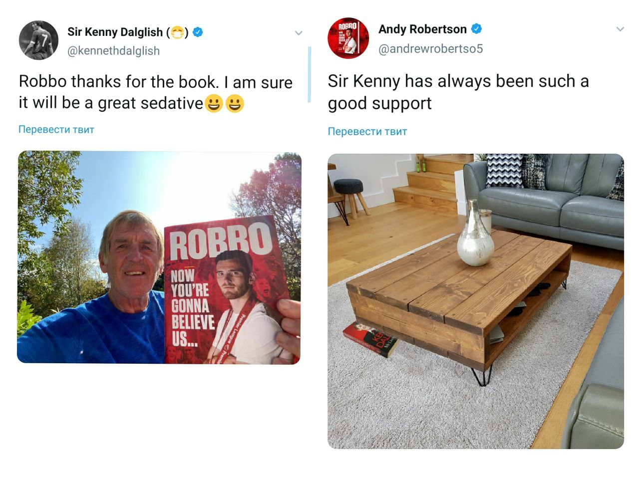 Защитник Эндрю Робертсон недавно выпустил автобиографию «Robbo: Now You’re Gunna Believe Us» и отправил один из экземпляров легенде клуба Кенни Далглишу. Тот отреагировал у себя в твиттере: «Роббо, спасибо за книгу. Уверен, отличный седатив».