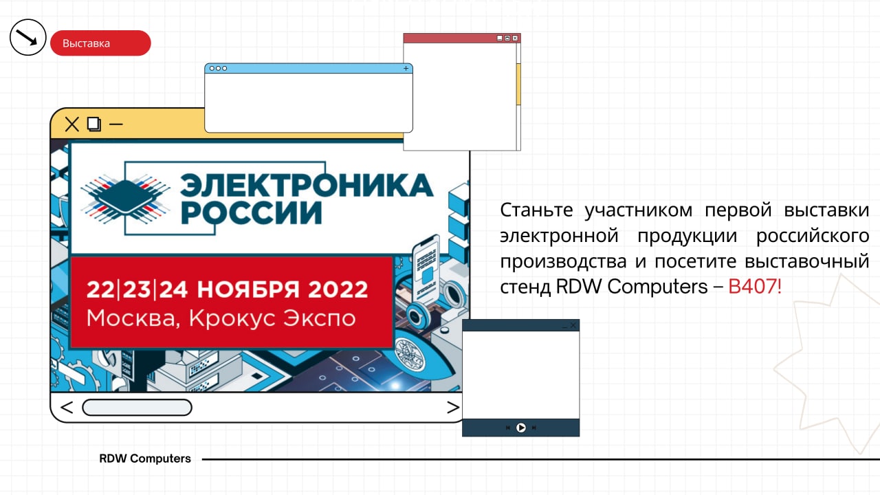 📌 22 - 24 ноября в Москве, в МВЦ «Крокус Экспо» пройдет выставка электронной продукции российского производства «Электроника России». В одном ряду с передовыми достижениями российской электронной промышленности, на своем стенде представим устройства, выпускаемые в России под брендом RDW Computers. Чуть подробнее смотрите на сайте выставки.