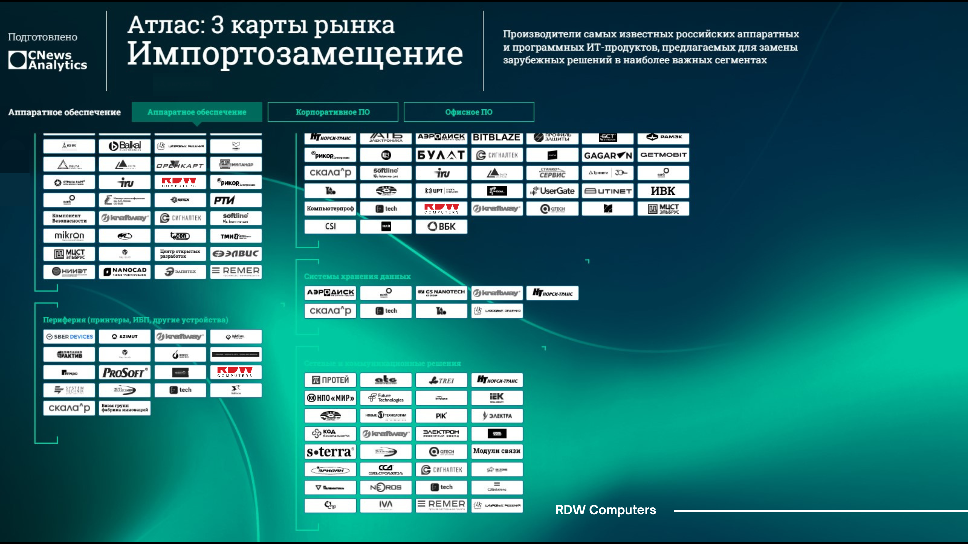Друзья, CNEWS ANALYTICS вновь выпустил карту импортозамещения, где представлены производители самых известных российских аппаратных и программных ИТ-продуктов, предлагаемых для замены зарубежных решений. Напомним, что в прошлом году карта выпускалась впервые и об этом можете почитать подробнее, перейдя в другой наш пост.