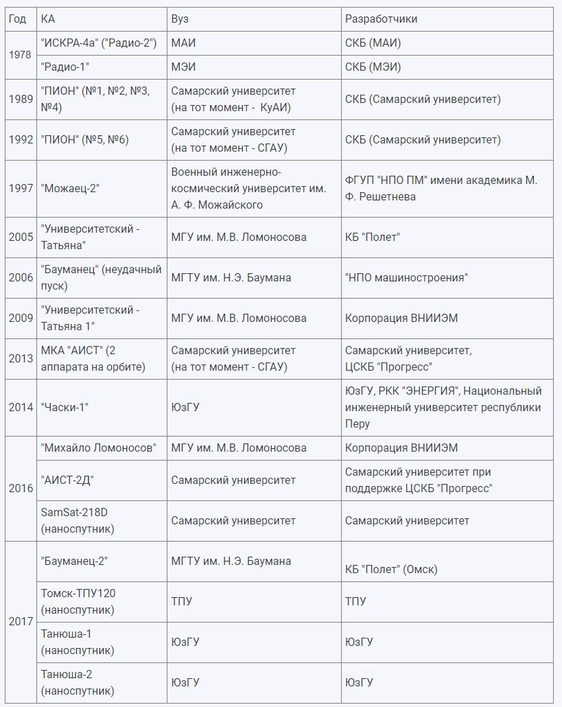 Краткая хронологическая таблица студенческого и университетского спутникостроения СССР и России.