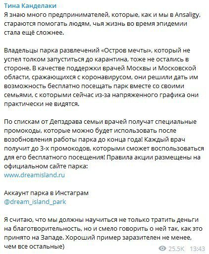 Разорившийся «Остров мечты» – мегапроект Сергея Собянина, Зелимхана Муцоева и Амирхана Мори, который не платит рабочим и подрядчикам (публикуется все больше новых свидетельств), также находит деньги на работу с соцсетями. Сообщения от обманутых работников и бизнесменов (как) по команде «обрастают» однотипными комментариями о том, как же хорошо устроен «Диснейленд» депутата Госдумы и его партнеров. Размещаются «деревянные» пресс-релизы на сайте («рекламно-информационного») агентства ТАСС, а также не менее деревянные посты в telegram у запылившихся «лидеров общественного мнения» наподобие Тины Канделаки (см скриншот).