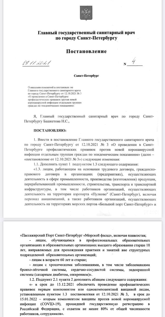 Постановление главного государственного санитарного врача по городу Санкт-Петербургу от 9 ноября 2021 года № 4 "О внесении изменений…