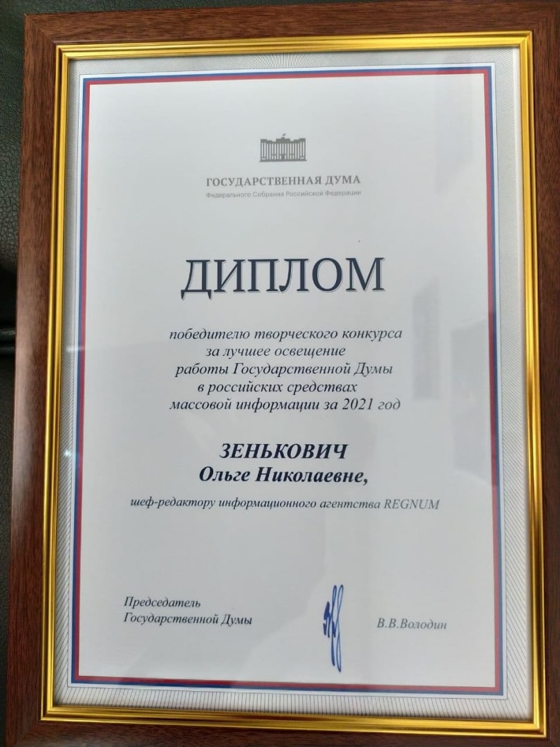 Также спикер Госдумы Вячеслав Володин вручил диплом победителю творческого конкурса за лучшее освещение работы Госдумы в российских СМИ за 2021 год шеф-редактору ИА REGNUM Ольге Зенькович.