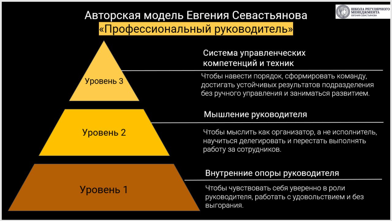 В моей авторской модели "Профессиональный руководитель", на основе которой построено обучение, выделяю три уровня: