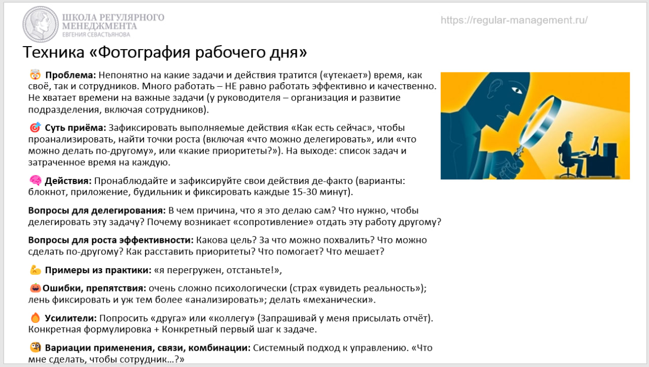 Если ответ на оба вопроса "ДА", но при этом вам НЕ удаётся использовать технику "Фотография рабочего дня" на практике - чтобы решить эту проблему - рекомендую пройти мини-курс «Экстренная помощь руководителю: Как перестать делать работу и думать за сотрудников, и начать получать результаты их руками» за