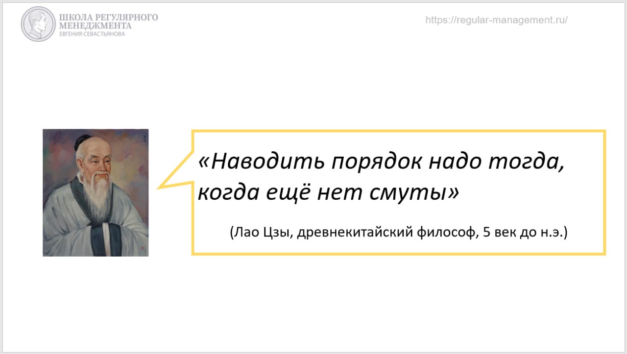 Лао Цзы, древнекитайский философ, говорил: «Наводить порядок надо тогда, когда ещё нет смуты».