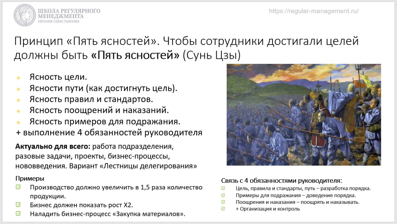 Выводы: Пять ясностей Сунь-Цзы актуальны для всех сфер деятельности: работа подразделения и компании, разовые задачи, проекты, бизнес-процессы. Формирование всех перечисленных ясностей - это наша, как руководителей, обязанностей и ответственность. Увы, не сами они себя создают.