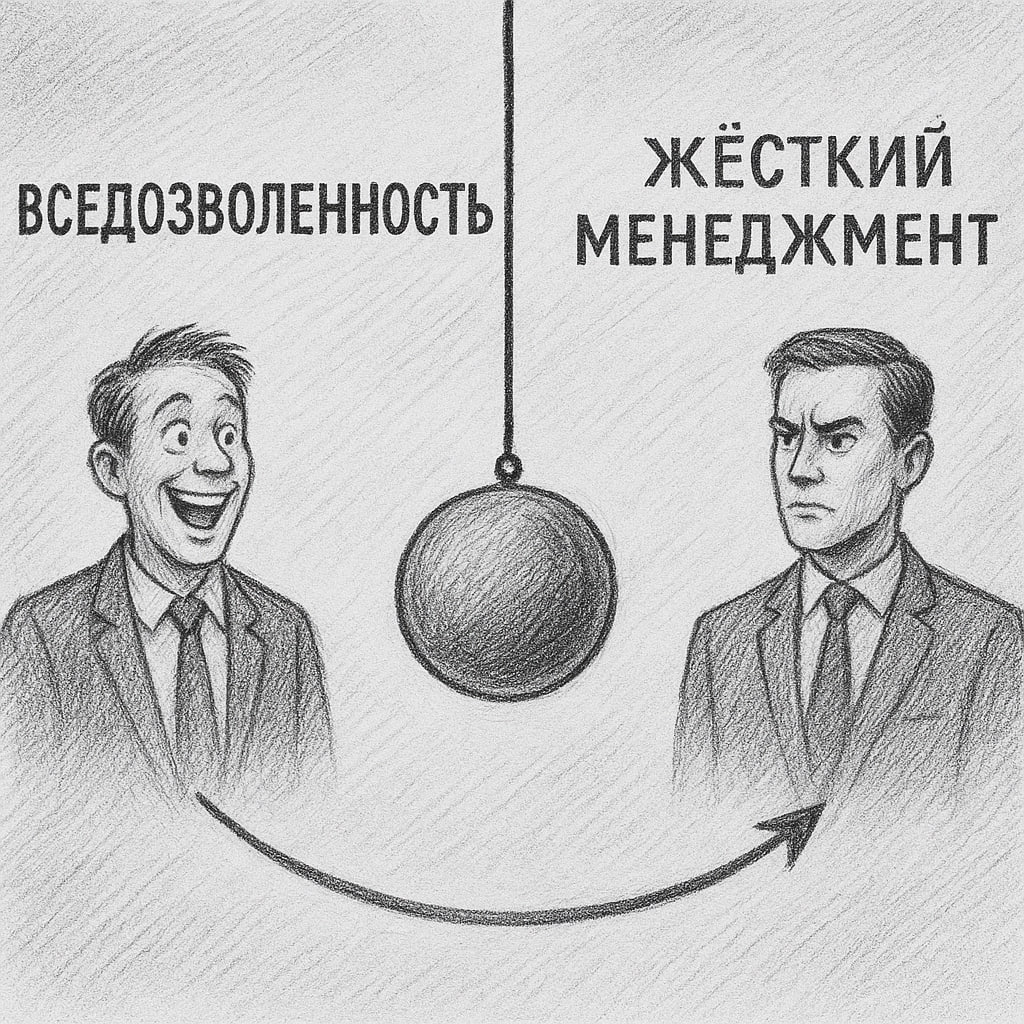 Жёсткий менеджмент начинает выталкивать наиболее сильных сотрудников или же делать из них антилидеров. Доходит до точки кипения и... снова переключаемся в режим "свобода и братство".