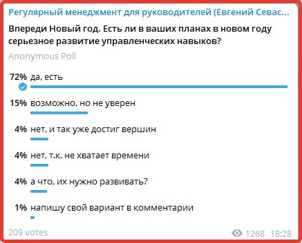 Прокомментирую результаты опроса "Есть ли в ваших планах в новом году (2026) серьезное развитие управленческих навыков?" на 11:30 мск, 10.12.25: