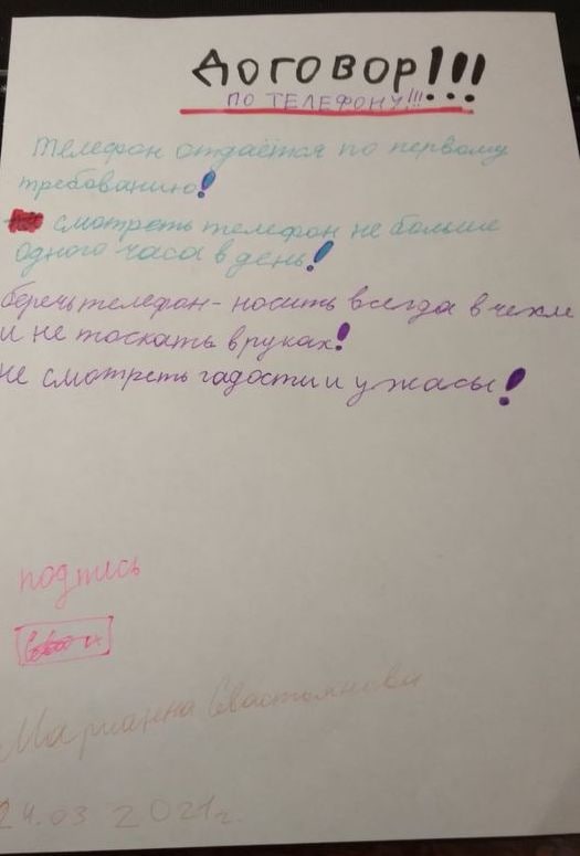 Прежде чем купить мы чётко обсудили условия использования, Марианна зафиксировали их письменно собственной рукой и поставила свою подпись. Мы подробно обсудили как соглашение будет применяться на практике. И у меня есть уверенность, что таких как раньше проблем с телефоном уже не будет.