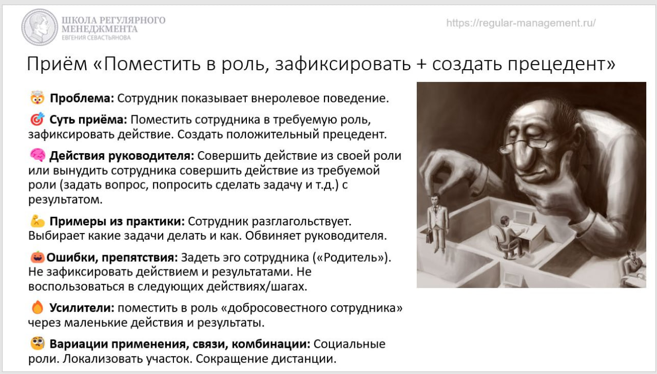Приём «Поместить в роль, зафиксировать + создать прецедент». Смысл: возвращаем с помощью небольших действий в роль сотрудника.