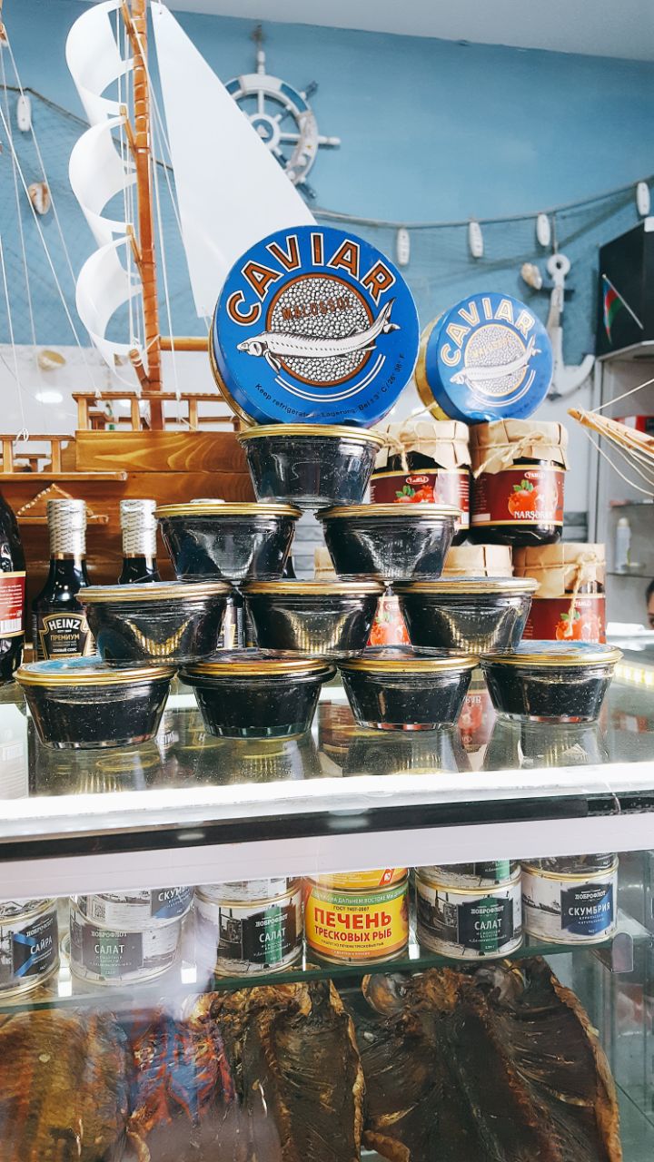 Обычно за икрой все советуют ехать на базар - туристический Яшыл базар или новый Тезе базар (в новостройке AF Com Plaza). На местных форумах советуют даже конкретных продавцов (например, некого Гябиля на первом этаже Тезе базара).