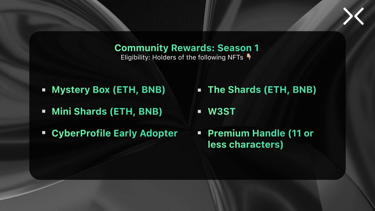 В первом сезоне разделят награды обладатели: Mistery Box; Shards; MiniShards; W3ST; Early adopter CyberProfile NFT.