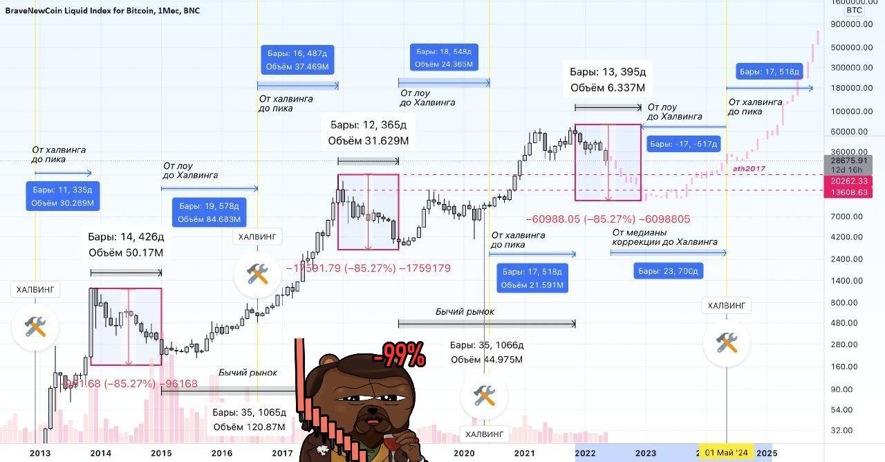 Исторически всегда наблюдался рост перед халвингом и соответственно постхалвинговый рост, так же почти каждый даунтренд до наших дней заканчивался зимой, соответственно дна мы должны касаться ~зимой 23 года