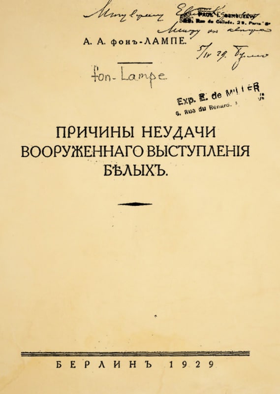 фон Лампе А. А. Причины неудачи вооруженного выступления белых. Берлин, 1929.