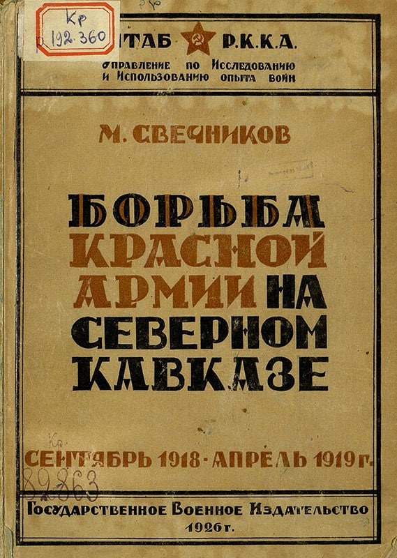 Свечников М. С. Борьба Красной Армии на Северном Кавказе (сентябрь 1918 - апрель 1919). М., Л.: 1926.