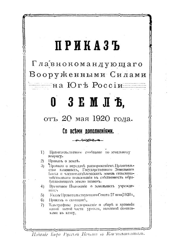 Приказ Главнокомандующего Вооруженными силами на Юге России о земле от 20 мая 1920 года. Константинополь, 1920.