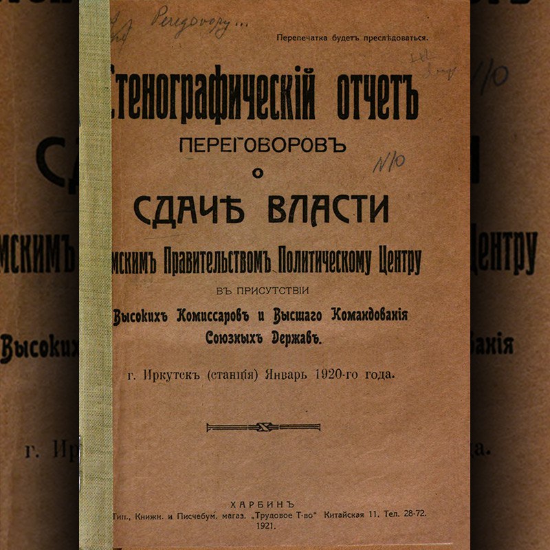 Стенографический отчет переговоров о сдаче власти Омским правительством Политическому центру в присутствии высоких комиссаров и высшего командования союзных держав. Харбин, 1921.