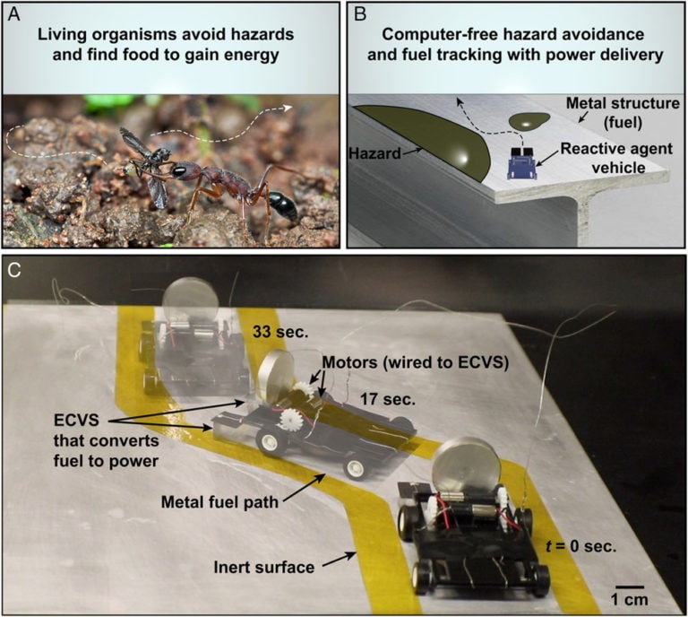 Инженеры из Пенсильванского университета собрали робота, который получает энергию для движения из окружающей среды. Для этого ему требуется каталитический источник энергии, который образован как из частей робота, так и из окружающей среды.