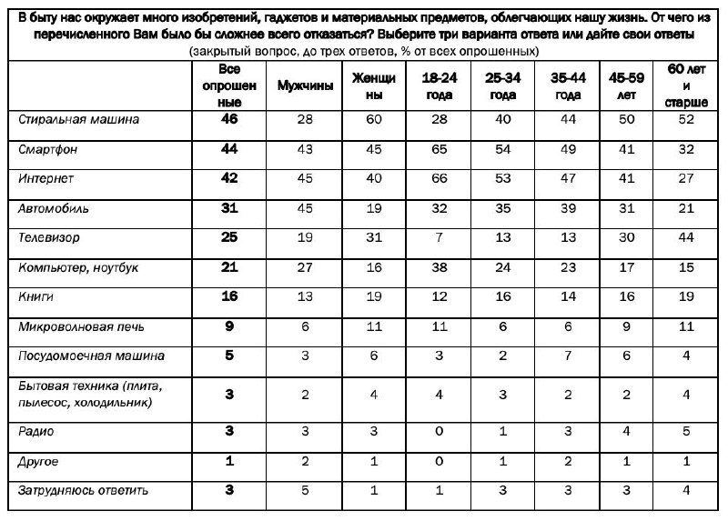 Из бытовых изобретений и гаджетов, облегчающих жизнь, россиянам сложнее всего отказаться от стиральной машины (46%). На втором месте — смартфон (44%), с небольшим отрывом на третьем месте интернет, его назвали 42% опрошенных.