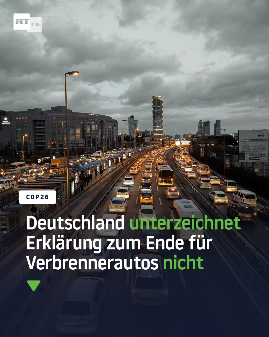 Auf der Weltklimakonferenz in Glasgow erklärte ein Sprecher des Bundesumweltministeriums, Deutschland werde die Erklärung zu Null-Emissions-Autos "heute nicht unterzeichnen". Dies sei das Ergebnis einer regierungsinternen Prüfung. Damit beteiligt sich Deutschland nicht an der Allianz von 24 Staaten, die ein Ende für den Verbrennungsmotor festsetzen wollen.