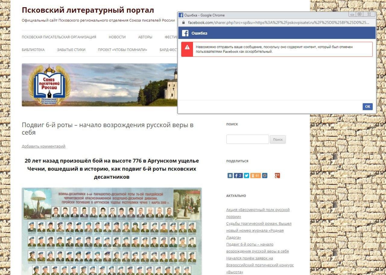 Соцсеть запретила делиться записями с сайта Псковской писательской организации. Именно она организовала поэтический конкурс «Высота» в честь 6-й роты 104-го полка Псковской дивизии ВДВ.