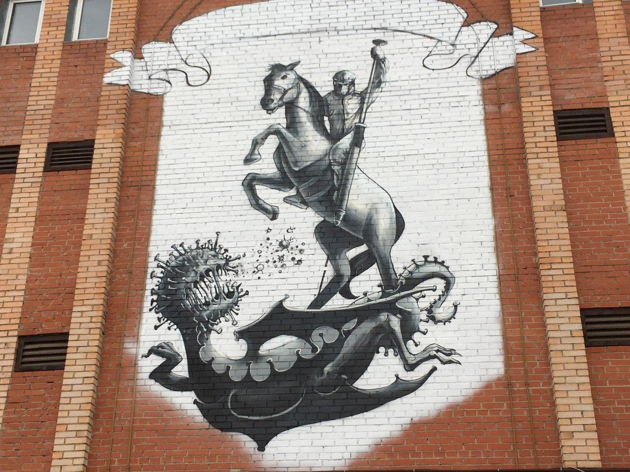 За основу взята работа, на которой Георгий Победоносец пронзает копьём змея. Вместо Победоносца — врач, вместо змея — коронавирус.