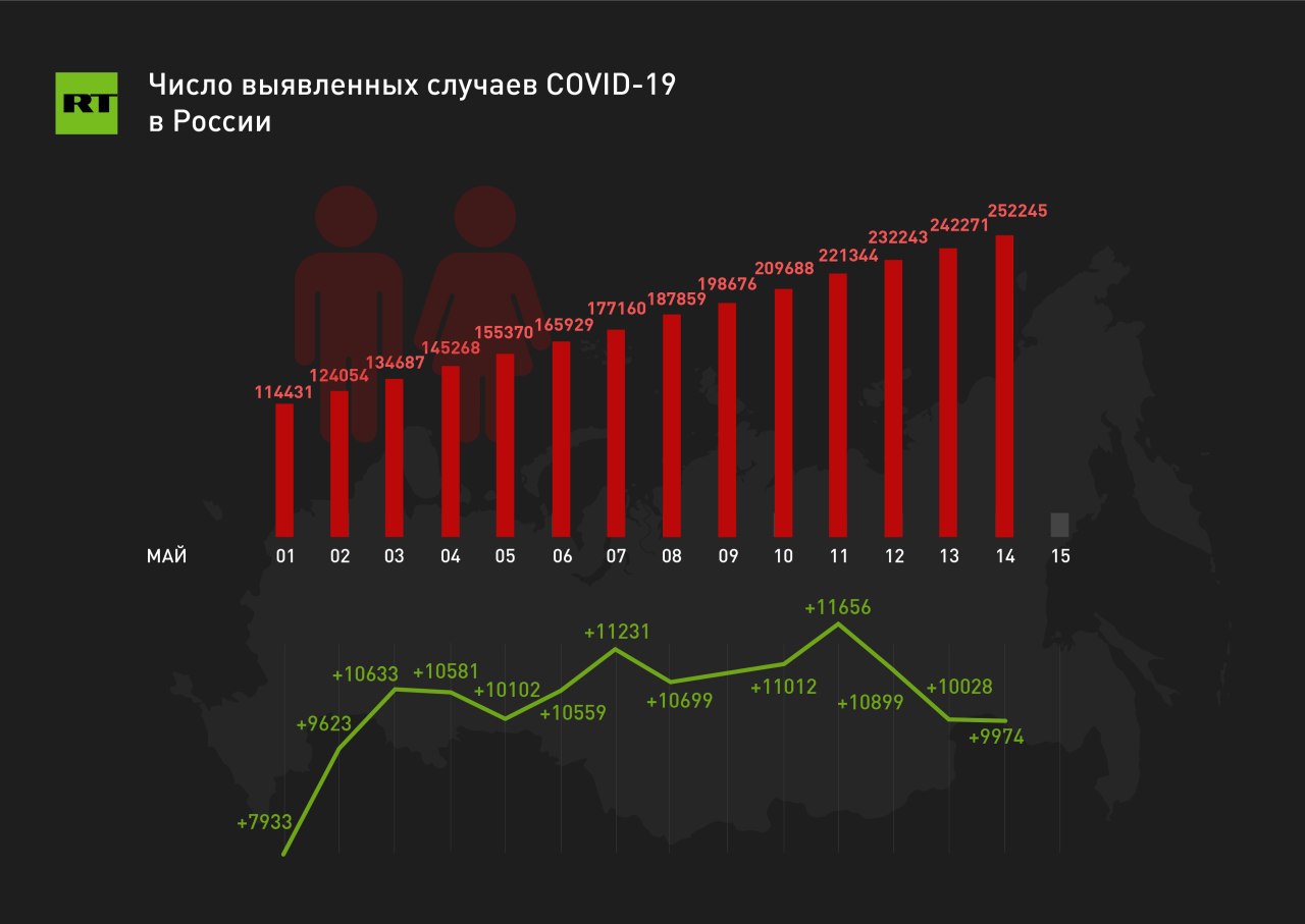 Общее число выявленных случаев заболевания на 14 мая в стране — 252 245. Скончались 2305 человек, выздоровели 53 530