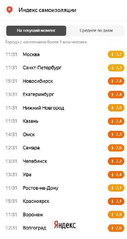 Индекс самоизоляции к этому часу: в городах-миллионниках на улицах очень много людей.