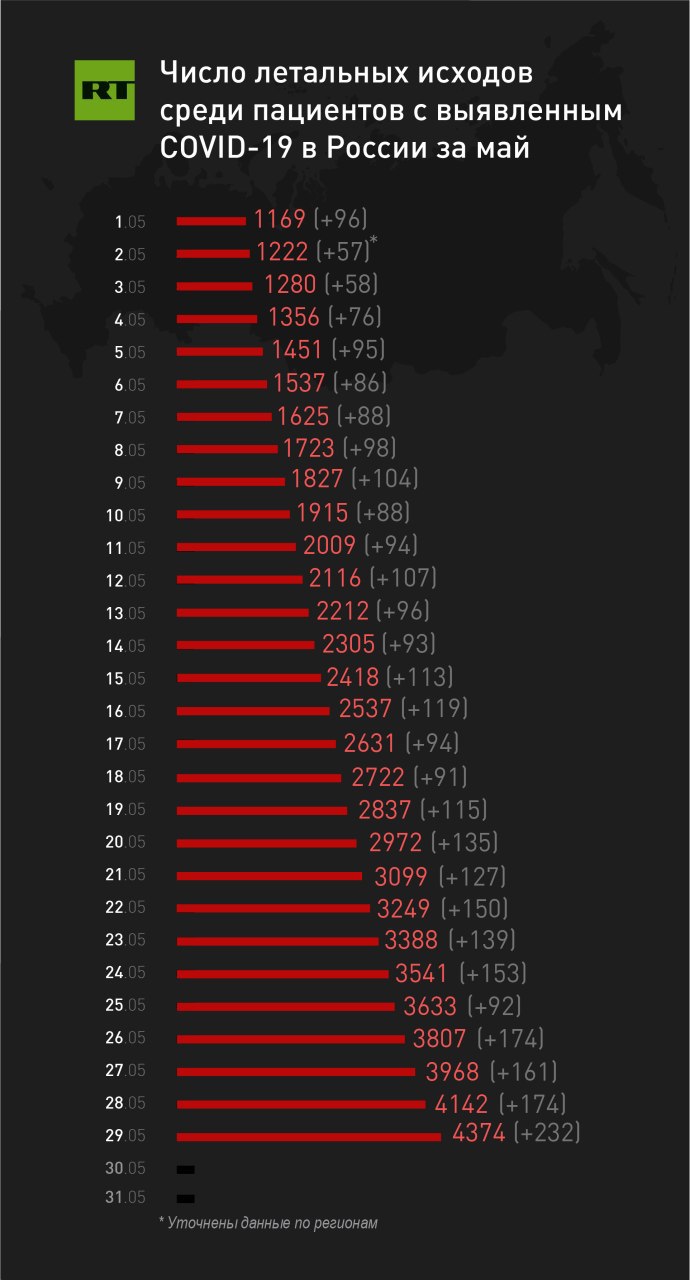 Всего на 29 мая в стране выявлено 387 623 случая заболевания COVID-19. Скончались 4374 человека (232 — за последние сутки), 159 257 выздоровели