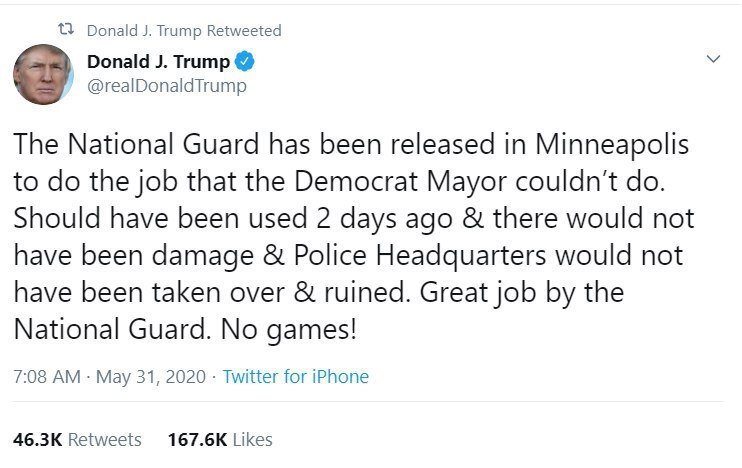 «Для решения задачи, с которой не справился мэр-демократ, в Миннеаполис была введена Национальная гвардия. Её следовало направить туда ещё два дня назад, тогда удалось бы избежать такого ущерба и полицейский участок не был бы захвачен и уничтожен. Национальная гвардия не тратит время попусту, а отлично делает свою работу!»