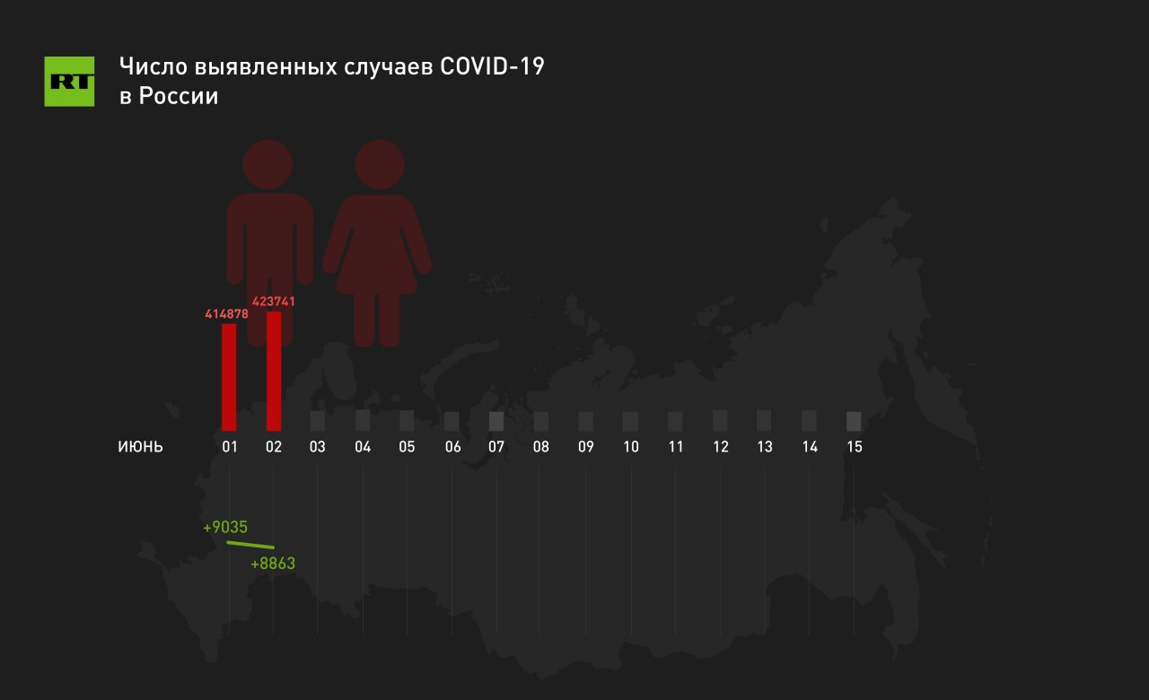 ⚡️ 8863 случая коронавируса зафиксировано за сутки в России. Общее число подтверждённых случаев — 423 741, сообщил оперштаб.