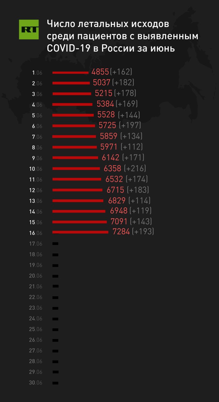 ⚡️В России за сутки умерли 193 человека с подтверждённым коронавирусом. Общее число летальных случаев — 7284, заявили в оперштабе.