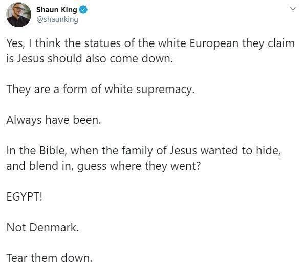 «Да, думаю, статуи белого европейца, каковым, по их заявлениям, является Иисус, тоже надо снести. Эти статуи — проявление превосходства белых. Всегда были им. В Библии, когда семья Иисуса хотела спрятаться и смешаться с местным населением, угадайте, куда они отправились? В ЕГИПЕТ! Не в Данию. Сносите статуи», — написал Шон Кинг.