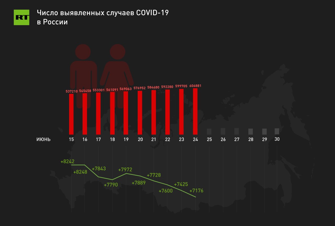 Всего на 24 июня в стране выявлен 606 881 случай заболевания коронавирусной инфекцией. Скончались 8513 человек (154 — за последние сутки), выздоровели 368 822