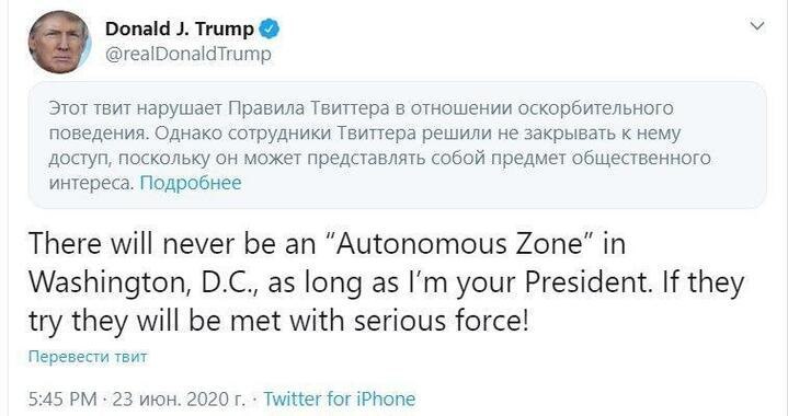 Ранее Трамп написал, что в Вашингтоне никогда не будет «автономной зоны».