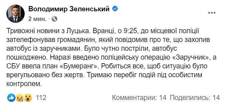Владимир Зеленский заявил, что держит ситуацию с захватом заложников в Луцке под личным контролем