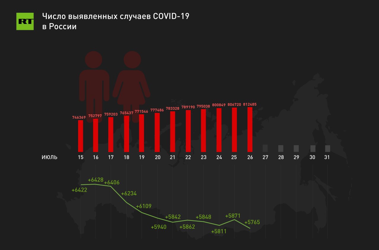 Общее число выявленных случаев заболевания — 812 485, выздоровели 600 250 человек
