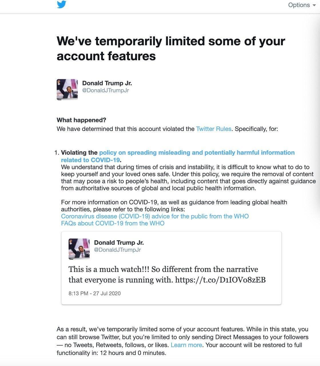 На время бана Трамп-младший не сможет публиковать и репостить, но не уточняется, что будет, если твит не будет удалён.