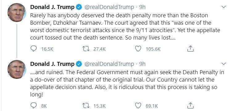 «Вряд ли кто заслуживал смертной казни больше, чем бостонский террорист Джохар Царнаев. Наша страна не может оставить апелляционное решение в силе», — заявил Трамп.